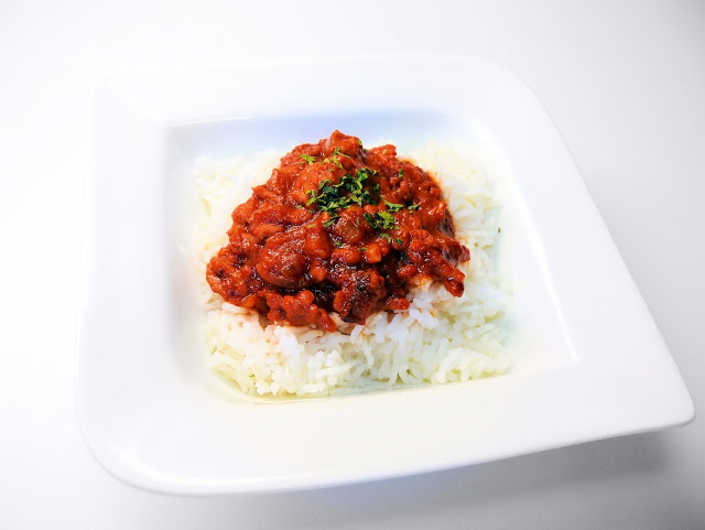 Tällä kertaa kokeilin käyttää broilerin paistijauhelihaa kanasuikaleiden tilalla Tikka Masla:ssa ja se onnistui tosi hyvin, lisäksi ateria oli nopea valmistaa ja liha kypsyy kivan mureaksi. Paistoin yhden pilkotun sipulin ja neljä pilkottua valkosipulin kynttä kevyesti, lisäsin 400g broilerin jauhelihaa ja jatkoin paistamista kunnes liika neste oli haihtunut ja sai vähän väriä. Lisäsin 50 g tomaattipyreetä, 3 tl punaista currytahnaa, 2 rkl garam masala mausteseosta ja 1 ½ tl suolaa. Paistoin hetken kasaan ja lisäsin 1 ½ dl rypsikermaa, alensin lämpöä ja lisäsi hitaasti 3 dl rasvatonta maustamatonta jogurttia. Lisäsin 1 rkl sitruunamehua ja annoin vielä kiehua hetken kasaan (tästä tuli suht vahvaa eli jos haluaa lapsiystävällisemmän version, niin voi vähentää currytahnaa).