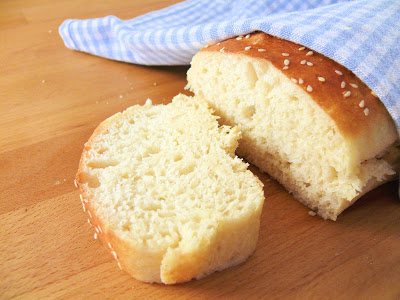 Lämmitä maito ja vesi kädenlämpöiseksi ja kaada kulhoon, lisää hiiva ja sokeri. Anna hiivan herätä n.5 min tai kunnes se käy näkyvästi. Lisää suola, rasva ja pikkuhiljaa n. 4dl erikoisvehnäjauhoja, seoksen pitää olla niin löysää että se on juuri ja juuri vaivattavissa. Vaivaa kunnes tasaista ja anna kohota 2 tuntia. Kaada löysä taikina voideltuun 1 ½ L vuokaan, anna kohota n. 15min lämpimässä paikassa, valele kanamunan valkuaisella ja ripottele päälle seesamsiemeniä. Paista 225 asteisessa uunissa kunnes pinnaltaan kauniin värinen (uunista riippuen 10-20 min).Vinkki: jos sinulla on leipäkone, voit valmistaa taikinan siinä, kevyt taikina ohjelmalla, mutta paista leipä erillisessä vuoassa tavallisessa uunissa