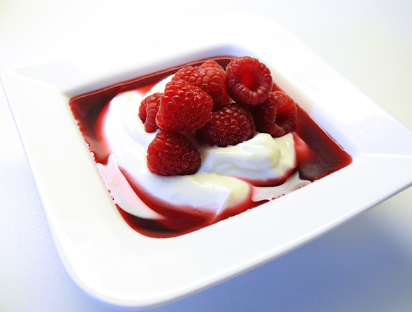Kaikessa yksinkertaisuudessaan otetaan purkki rasvatonta rahkaa, kaadetaan se jälkiruokastiaan, laitetaan tuoreita vadelmia päälle ja reunoille Valion mustikkakeittoa. Rahkan tilalla voi käyttää myös rahkajogurttia.