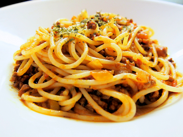 Pilko sipuli, laita pannuun oliiviöljyä ja lisää sipulit ja valkosipuli. Paista kunnes sipulit ovat läpikuultavia. Lisää jauheliha, jatka paistamista kunnes jauheliha ei ole enää punaista, älä ruskista! (jos ruskistat lihasta ei tule mureata vaan kovaa). Lisää oregano, basilika ja tomaattipyree, paista noin 1 min, näin yrtit irrottavat rasvansa ja maku voimistuu ja pyree ei jää kitkeräksi. Lisää tomaattimurska, vesi, sitruunamehu, balsamico, suola, sokeri, mustapippuri ja laakerinlehdet. Vähennä lämpöä ja anna hautua alhaisella lämmöllä vähintään 40min.