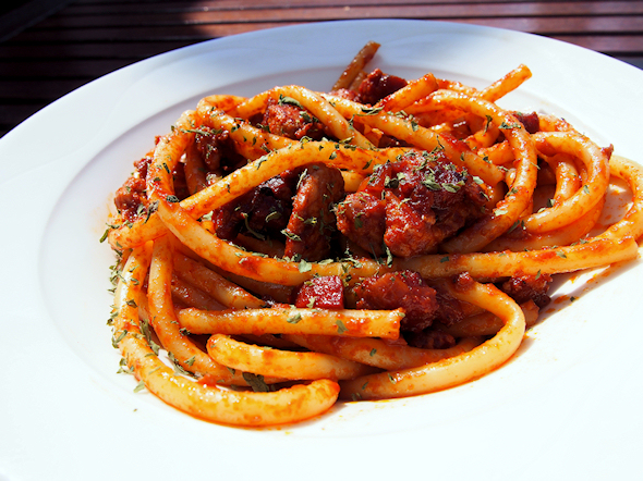 Laita pasta kiehumaan suolaiseen veteen. Pilko sipuli ja chorizo-makkara kuutioiksi. Laita pannuun sen verran oliiviöljyä, että pohja peittyy.