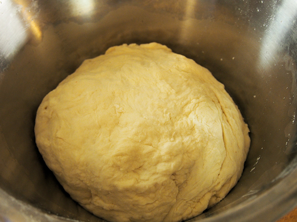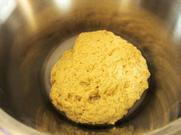 Sekoita vesi ja vehnäjauho kulhossa niin että siitä tulee pullataikinan kaltainen pallo. Mikäli taikina tarttuu liikaa käsin voit lisätä vielä hiukan vehnäjauhoja kunnes saat muodostettua taikinasta pallon.