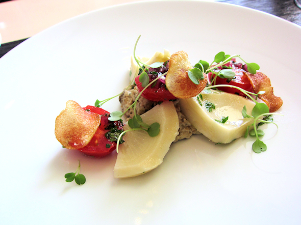 Sasso:ssa meidän toivotettiin ystävällisesti tervetulleeksi ja johdateltiin pöytään, hyvin lyhyen juttuhetken päätteeksi pöytään tuotiin raikas alkuruoka, Artisokansydämiä, munakoisokaviaaria, kirsikkatomaattia, tuoreita yrttejä ja perunalastuja. Minulla kävi onni sillä olen suuri Artisokan ystävä ja alkupala oli todella herkullinen ja herätti ruokahalua.