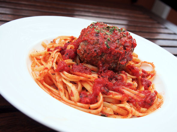 Sekoita jauheliha, sokeri ja suola. Lisää kananmuna, korppujauho, juustoraaste, maustepippuri ja mustapippuri, sekoita ensin haarukalla ja kun rupeaa menemään kasaan niin vaivaa käsin kunnes on tasainen massa. Muodosta taikinasta 4 isoa lihapulaa. Paista lihapullia 150 asteissa uunissa 20min. Kuumenna oliiviöljy pannulla ja lisää lihapullat, paista niitä hetken niin että saavat kauniin pinnan. Lisää tomaattimurska, valkosipuli, balsamico etikka, suola, basilika, oregano ja Tabascoa maun mukaan. Laita pasta kiehumaa ja anna lihapullien hautua kastikeesaan alhaisessa lämmössä kunnes pasta on valmista.