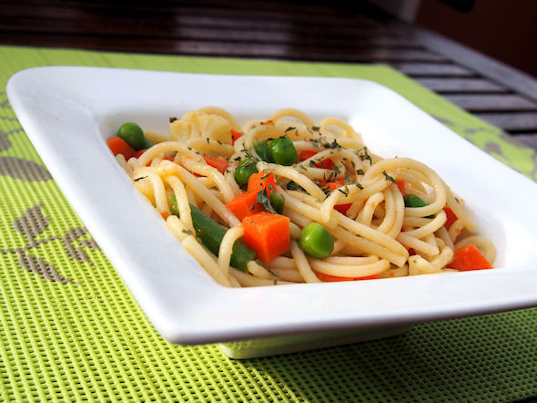Toinen ruoka jota poikana mielellään söin, oli spagetti jossa ei ollut muita mausteita kuin voi tai liha/kasviliemi, tämä oli samalla myös yksi ensimmäisiä ruokia joita opin itse tekemään. Pysyäksemme nostalgia linjalla niin nyt joukossa on kasviliemi -annosfondin lisäksi pussillinen sekavihanneksia joka antaa tähän ”kesäkeitto” tyypisen vivahteen. Voit tarjota sekavihannesspagetin alkuruokana tai lisäkkeenä.
