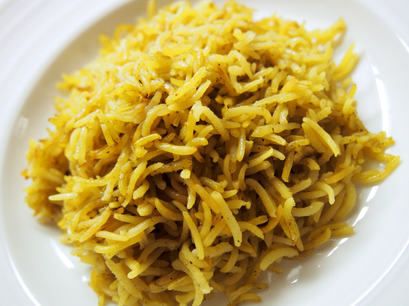 Laitia isoon paistinpannun tai wokkiin se verran ruokaöljyä tai kirkastettu voita että pohja peittyy, kun se on kuumaa lisää riisi, paista riisiä jatkuvasti sekoittaen kunnes siinä on kiiltävä pinta. Lisää garam masala ja kurkuma, paista kunnes mausteet tuoksuvat. Lisää vesi, kanafondi ja suola, kun kanafondi on sulanut siirrä seos uunikestävään astiaan.