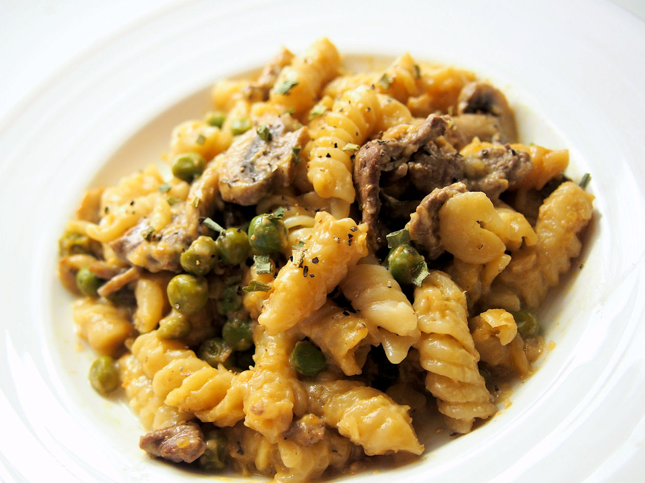 Laita paistinpannuun uusi kerros oliiviöljyä ja kun se on kuumaa lisää sinne sisäpaistisukaleet, paista suikaleita hetken ja kun niistä alkaa irrota nestettä, lisää sienet. Jatka paistamista kunnes sienet ja liha ovat saaneet väriä, lisää suola, sokeri, mustapippuri ja jäiset pakasteherneet, pyöritä pannulla hetken ja lisää kerma, vesi sekä beef annosfondi, keitä kunnes fondi on sulannut. Lisää seos samaan uunikestävään vuokaan johon lisäsit sipuliseoksen, lisää vielä lähes kypsä kuviopasta ja parmesaaniraaste, sekoita kunnolla.