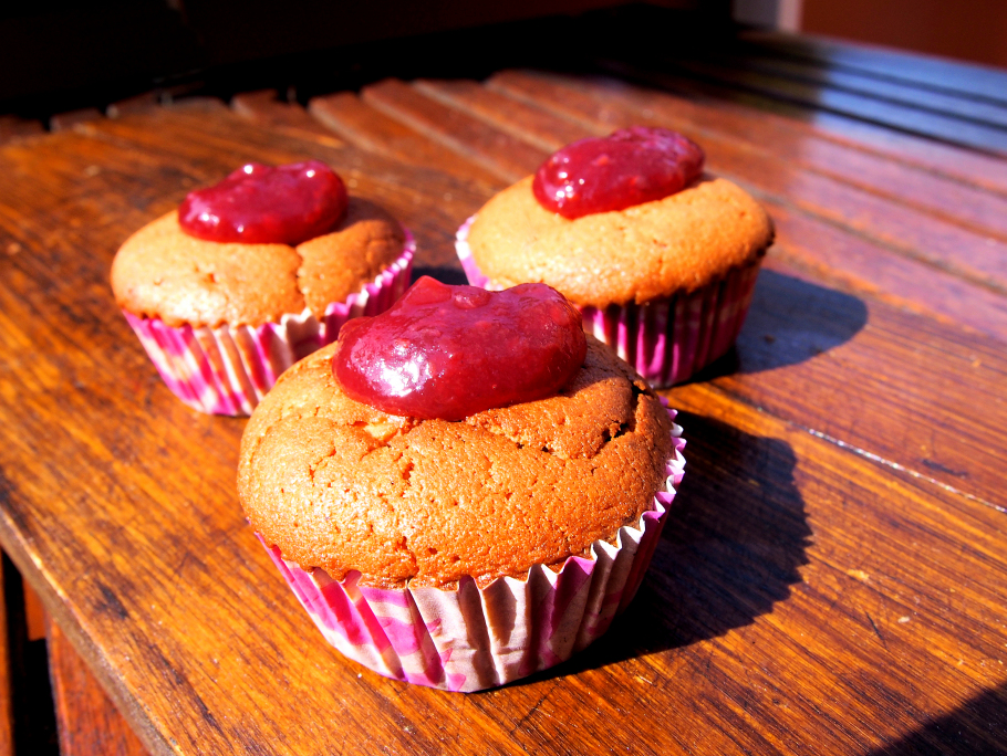 Kypsennä 200 asteisessa uunissa 25-30 minuuttia tai kunnes muffinssien pinnat ovat kauniin ruskeat. Voit tahtoessasi laitaa pinnalle vielä vadelmahilloa/marmelaadia.
