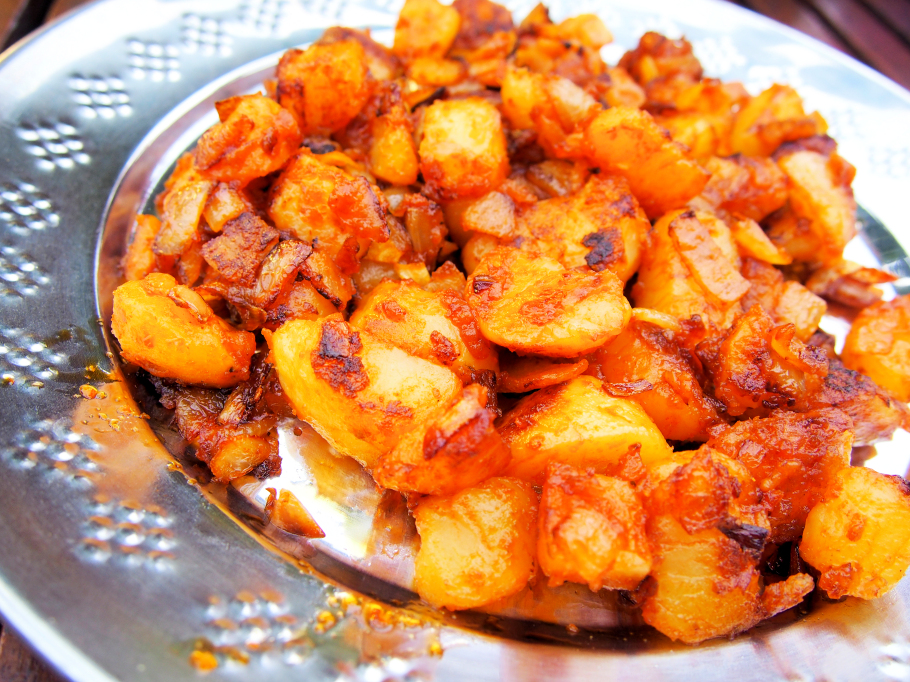 Silppua sipuli ja valkosipuli, paloittele perunat. Laita paistinpannuun oliiviöljy ja kun se on kuumaa, lisää perunat, valkosipuli ja sipuli. Paista niin kauan että rupeavat saamaan vähän väriä. Lisää soijakastike, savuaromi, suola ja Sriracha kastike, jatka paistamista kunnes perunoissa on hyvä paistopinta.