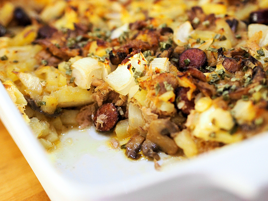 Kaada voideltuun vuokaan perunasuikaleet ja sipuli, chorizo/herkkusieni sekoitus, tonnikala, sitruunapippuri ja suola. Sekoita niin ett ainekset ovat jakautuneet tasaisesti, kaada joukkoon kerma ja maito.