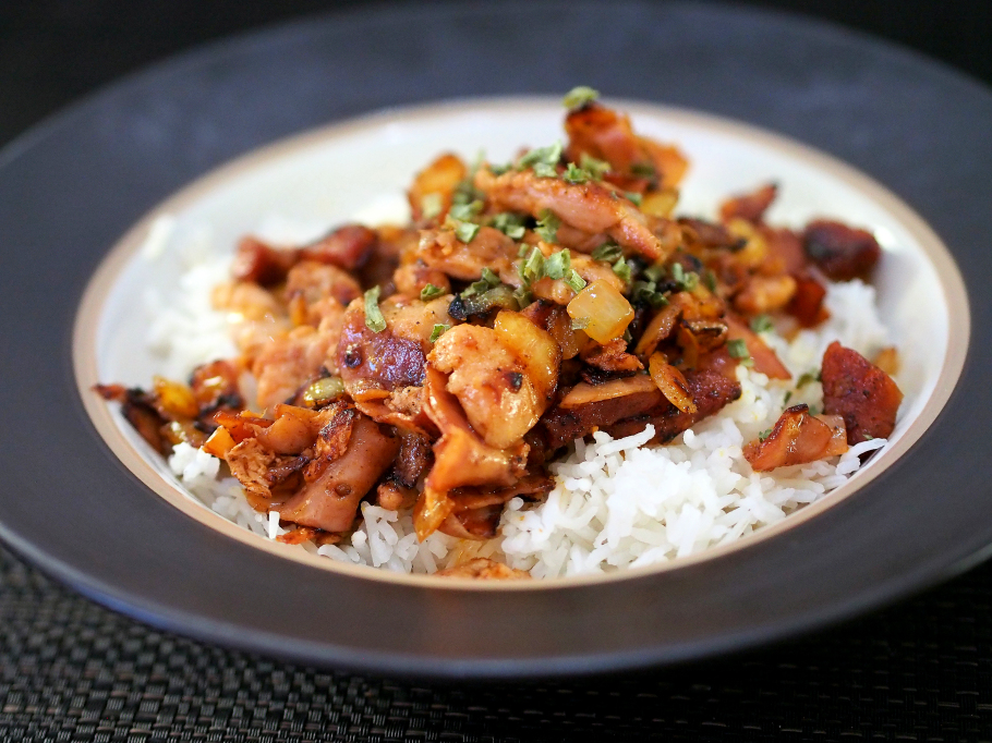 Pilko sipuli, paloittele chorizo (suurin pirtein saman kokoisiin paloihin kun broileri), viipaloi pekoni noin 2cm paloihin. Laita paistinpannuun pieni määrä paistinrasvaa (ei tarvitse jos on hyvä pannu), lisää chorizo palat ja kun niistä alkaa irtoamaan punaista rasvaa lisää pekoniviipaleet. Paista kunnes ovat saaneet vähän väriä, lisää sipuli ja valkosipulitahna ja jatka paistamista kunnes sipuli on läpikuultavaa, lisää broilerin paistisuikaleet, suola, mustapippuri ja Sriracha kastike ja jatka paistamista kunnes ovat läpikypsiä ja broilerin suikaleissakin on väriä (noin 5-10 minuuttia)