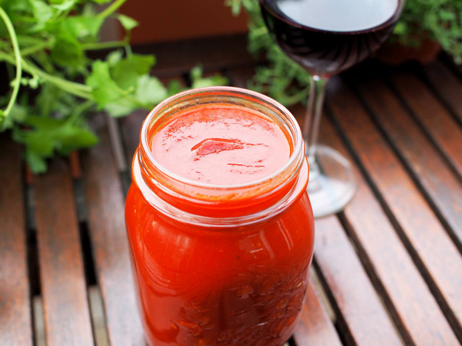 Käytä paistokasaria, isoa paistinpannua tai wok pannua. Laita oliiviöljy pannuun ja kun se on vähän lämmennyt lisää valkosipuli, paista valkosipulia keskilämmöllä kunnes siihen alkaa tulla paistopintaa (älä anna palaa), lisää tomaattipyree ja kääntele hetken (vähentää pyreen kitkeryyttä). Lisää paseerattu tomaatti, valkoviinietikka, ruokosokeri, suola, punaviini, Sriracha chilikastike ja kun seos kiehuu maizena suuruste.