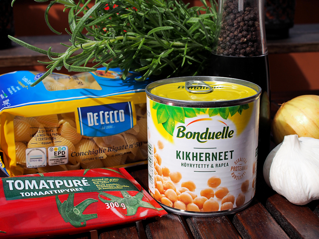 Lisää tomaattipyree ja paista hetki (pyreestä lähtee paistaessa kitkeryys), lisää kikherneet ja kääntele seosta hetken. Lisää rosmariini ja mustapippuri kääntele lyhyesti, lisää vesi, suola cayennepippuri ja kuiva pasta.
