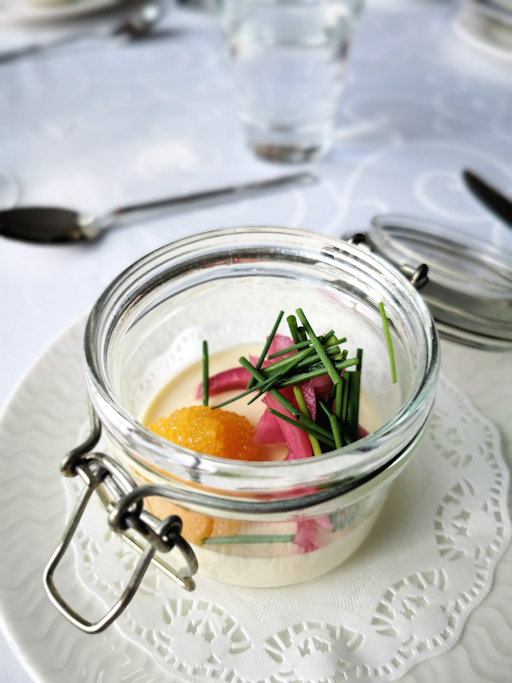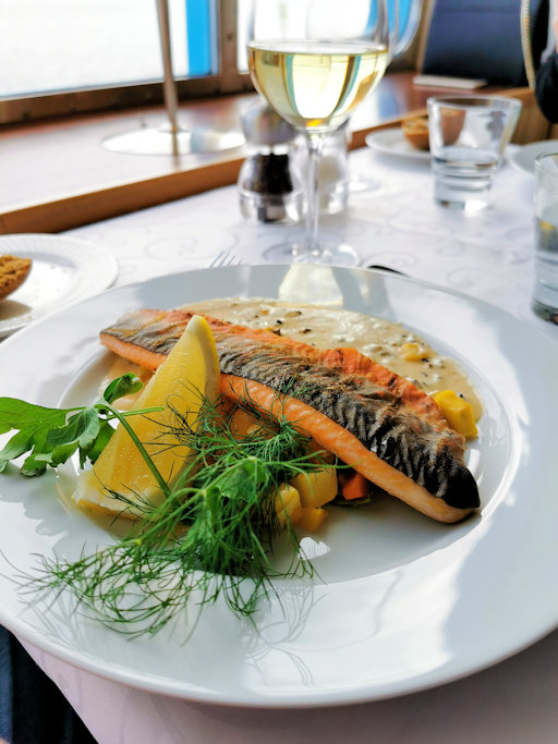 Menomatkalla lounastimme laivalla Happy Lobster ravintolassa jossa söimme uuden ryhmämenuun: alkuruokana tarjoiltiin Västerbotten pannacotta, siianmätiä ja punasipulia, pääruokana halstrattua nieriää, ecrasséperunaa, korvasienikastiketta ja syksyn vihanneksia sekä jälkiruokana Creme Brulée.