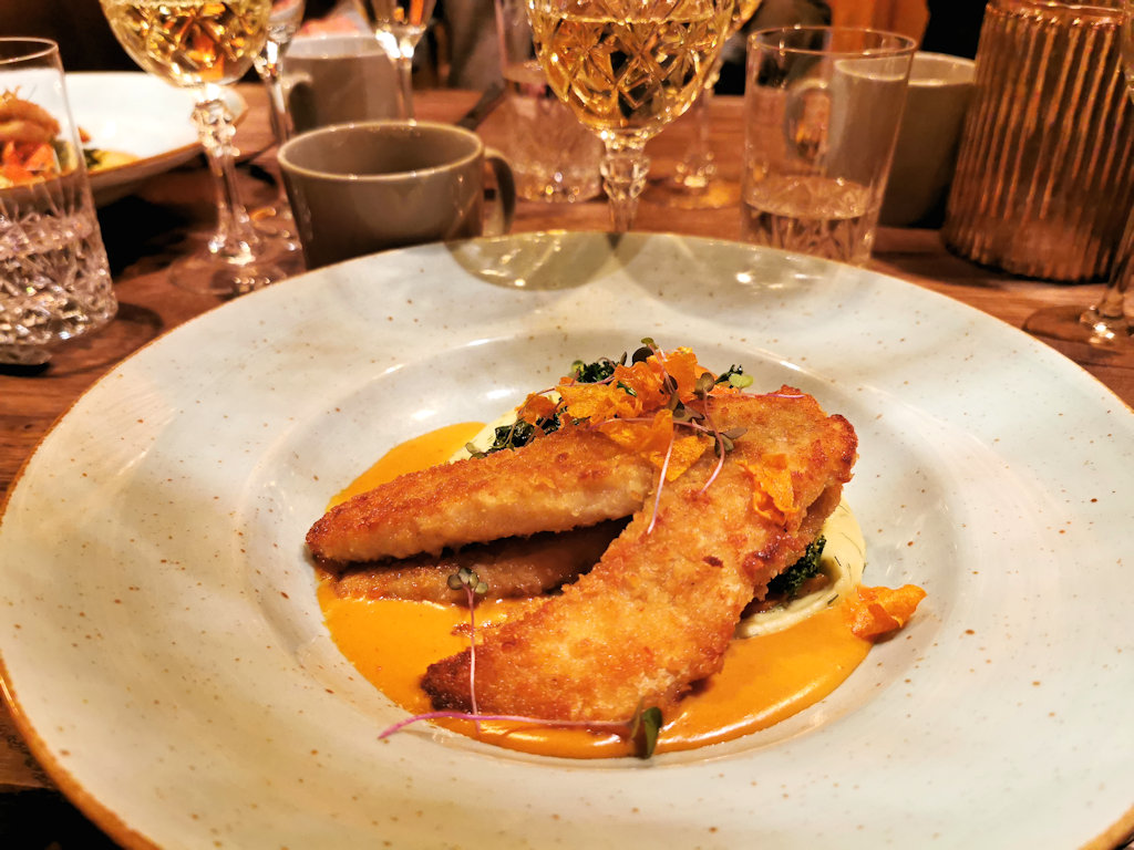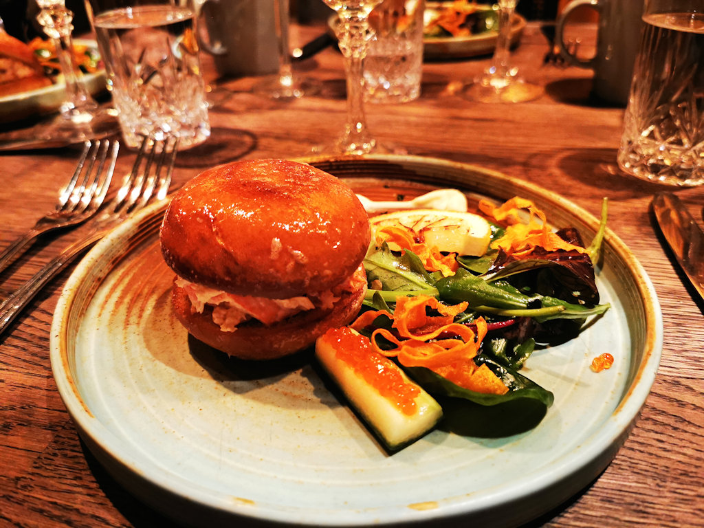 Alkuruokana meille tarjottiin Hummeri sliders ja pääruokana ahventa rapukastikeessa. Sliders oli kekseliäs ja maukas, Myös ahven oli hyvää ja kyseessä oli hyvin ahvenanmaalais- tyylinen annos.
